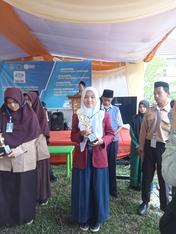 Perjuangan dan kerja keras Rahadatul Aisy siswi kelas 9 (anak dari Ibu Jamilatun, SE) yang merupakan salah satu guru IPS MTsN 7 Muaro Jambi) terbayar Ketika pengumuman OBA tingkat Provinsi dibacakan, Ananda Eci (sapaan akrab sehari hari) mendapatkan juara tiga pada OBA Tingkat Provinsi Jambi yang telah dilaksanakan pada hari Sabtu, 5 Oktober 2024 bertempat di Sekolah Islan Terpadu (SIT) An Nahl yang menjadi tuan rumah Olimpiade Bahasa Arab (OBA) ke-7 tingkat Provinsi Jambi tahun 2024 yang resmi di buka oleh Pjs Gubernur Jambi, Dr. H. Sudirman, S.H.,M.H.