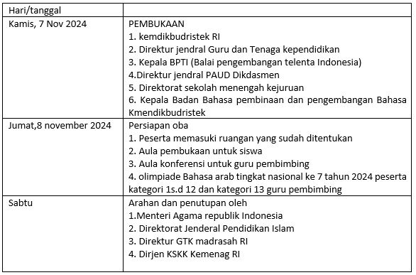 Acara OBA tingkat nasional akan di laksanakan 1, kamis, jumat dan sabtu di Asrama haji Pondok Gede Jakarta, dengan beberapa serangkaian acara yang telah di rangkum tertera pada tabel berikut